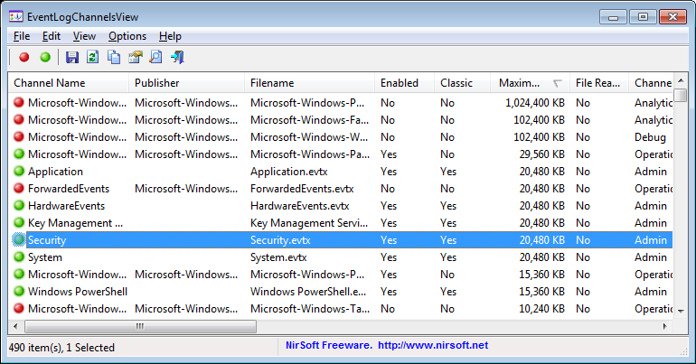 It also allows you to easily make some actions on multiple channels at once: enable/disable channels, set their maximum file size, and clear all events stored in the channels.