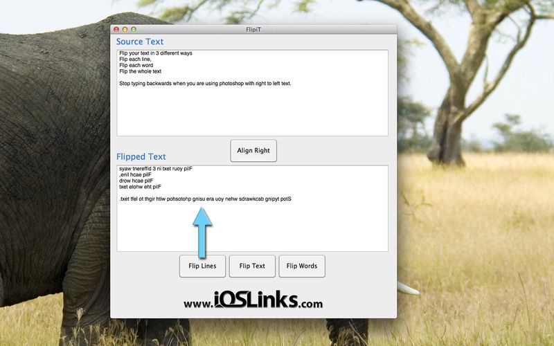 FlipiT! (โปรแกรม FlipiT! กลับตัวอักษร สลับตัวหนังสือ เรียงคำย้อนหลัง บน Mac) : สำหรับโปรแกรมนี้มีชื่อว่า โปรแกรม FlipiT! มันเป็นโปรแกรมสำหรับสลับตัวอักษร (Filp Text) เรียงคำอักษรย้อนหลัง (Filp Word) จากขวาไปซ้าย โดยที่คุณไม่ต้องพิมพ์เอง เหมาะสำหรับ งานที่คุณต้องใช้การพิมพ์ในลักษณะ การเขียนจากขวาไปซ้าย อย่างการเขียนจากประเทศตะวันออกกลาง (Middle Eastern) คุณสามารถใช้งานโปรแกรมนี้ เพื่อเรียงคำ และตัวหนังสือ ในรูปแบบต่างๆ ได้ตามต้องการ คัดลอก และ วาง จัดการตัวหนังสือ ได้ง่ายๆ