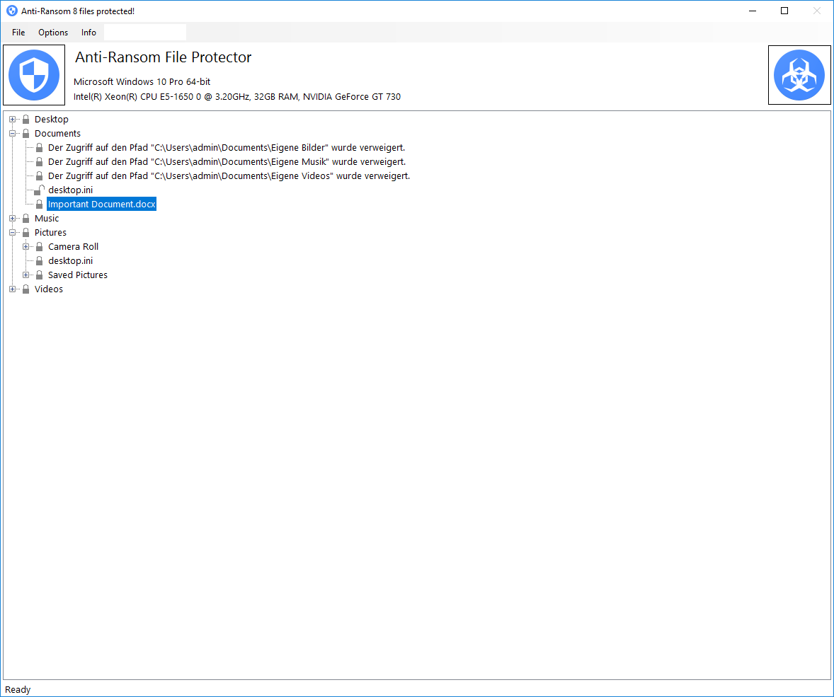 Once Anti-Ransom is installed and started, your files are protected from access. Your files can not be opened and written - only when you grant access to your files with Anti-Ransom File Protection, these files can be opened and edited. This gives you additional protection against Virus programs, Trojans programs and Ransom programs.