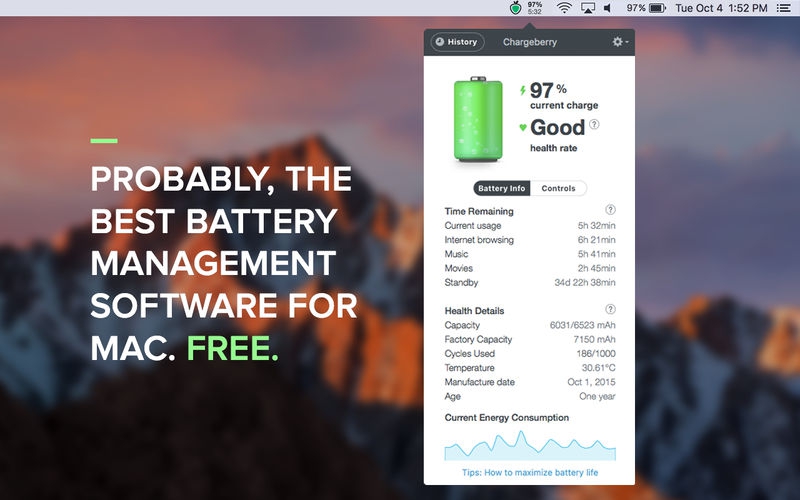 นอกจากนี้ โปรแกรมเช็คแบตเตอรี่ Chargeberry จากที่เช็คสถานะแบตเตอรี่ได้ตลอดแล้ว โปรแกรมนี้ยังแสดงค่าการใช้งาน โปรแกรมต่างๆ บนแบตเตอรี่ ภายในเครื่อง ให้ออกมาดูง่ายยิ่งขึ้น และยังแยกกิจกรรมที่คุณใช้งานอยู่ประจำเป็นส่วนๆ เช่น การท่องอินเทอร์เน็ต การดูหนัง และ การฟังเพลง หรือ เปิดเครื่องไว้เฉยๆ เป็นต้น ช่วยให้คุณเช็คประสิทธิภาพการทำงานแบตเตอรี่ได้ตลอดเวลา รักษาแบตเตอรี่ให้อยู่นานกว่าเดิม โปรแกรมนี้รองรับการใช้งานบนระบบปฏิบัติการ macOS 10.09 Mavericks เป็นต้นไปจนถึงเวอร์ชันล่าสุด หากใครสนใจก็สามารถดาวน์โหลดมาใช้งานบนเครื่องได้ทันทีฟรีๆ