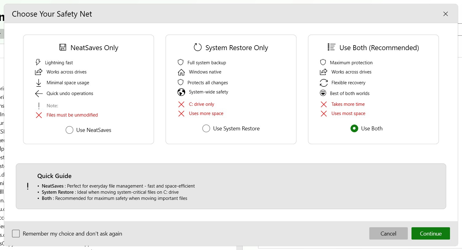 ในส่วนของ ส่วนต่อประสานกับผู้ใช้ (UI) ของโปรแกรมถูกออกแบบให้ทันสมัย รองรับทั้งโหมดสว่าง และโหมดมืด มีระบบสำรองข้อมูลก่อนการย้าย เช่น การสร้างจุดคืนค่าระบบ (System Restore Point) และฟีเจอร์ NeatSaves ซึ่งเป็นการสำรองแบบรวดเร็ว และใช้พื้นที่น้อย โดยผู้ใช้สามารถเลือกใช้ทั้งสองวิธีเพื่อความปลอดภัยสูงสุดก่อนดำเนินการย้ายไฟล์ นอกจากนี้ ยังมีระบบตรวจสอบความปลอดภัยก่อนดำเนินการ เช่น การแจ้งเตือนเมื่อ Symbolic Link ไม่สามารถสร้างได้ หรือเมื่อมีความเสี่ยงต่อข้อมูล