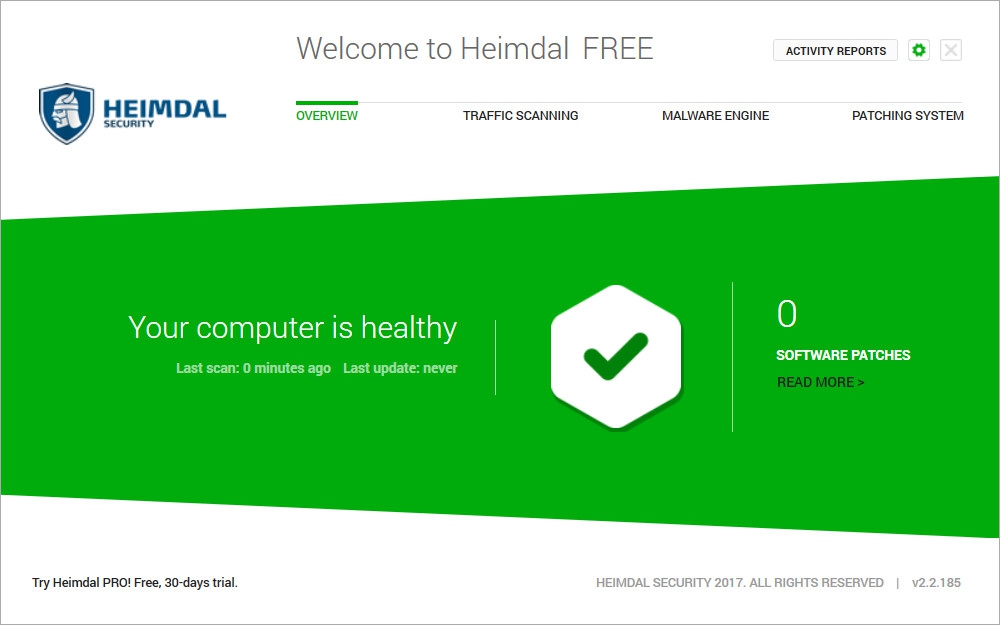 ถือว่า Heimdal Free เป็นโปรแกรมที่ดีอีกหนึ่งตัวเลย และยังมีเวอร์ชัน PRO ที่เพิ่มฟีเจอร์เด็ดๆ เช่น ฟีเจอร์สแกนไวรัส (Malware Engine) ที่ใช้สำหรับค้นหาโปรแกรมที่เข้าข่ายเป็นมัลแวร์ และมี ฟีเจอร์บันทึกการใช้งานของโปรแกรม (Traffic Scanning) ที่ช่วยจดบันทึกการความถี่ในการเรียกใช้งานอีกด้วยนะ หากใครสนใจก็สามารถอัพเกรดไปใช้เวอร์ชัน PRO ได้เลย ซึ่งจะเปิดให้เราใช้งานฟรี 30 วัน หากครบกำหนดจะต้องเสียเงินค่าลงทะเบียนนะ