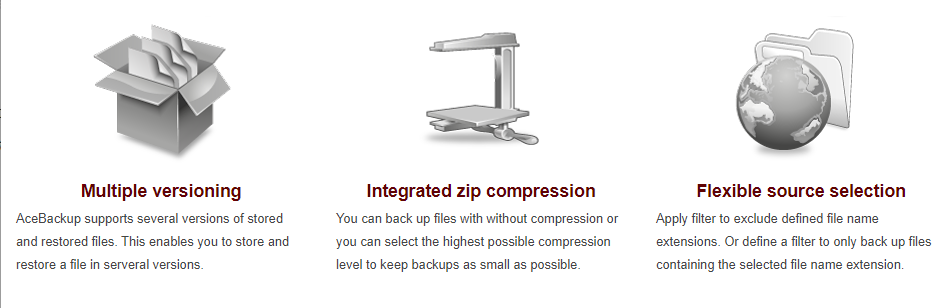 AceBackup allows you to back up your data locally or on any storage device. You can also back up your files on the internet or on FTP servers. Its effective performance is achieved through powerful functions and integration with Windows Explorer which makes it handle with ease. Scheduled, encrypted (up to 256 bit) and compressed backups. 1:1 Backup or Archive with individual paths. Restore data in the original folder or in any folder you like.
