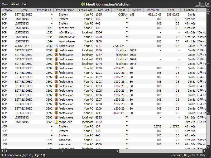 Moo0 Connection Watcher (โปรแกรมเช็คการเชื่อมต่อเน็ตเวิร์ค ฟรี) : สำหรับเจ้าตัวนี้ มีนามว่า โปรแกรม Moo0 Connection Watcher เป็นโปรแกรมดีใช้งานฟรี ที่มาจากผู้พัฒนา Moo0 แห่งแดนอาทิตย์อุทัยญี่ปุ่น มันมีความสามารถในการ ตรวจสอบการเชื่อมต่อระบบเน็ตเวิร์ค (Check Network Connections) ในคอมพิวเตอร์ของเรา ว่ามีโปรแกรมไหนใช้งานระบบเน็ตเวิร์ค หรืออินเทอร์เน็ตอยู่เท่าไหร่บ้าง ซึ่งสามารถตรวจสอบได้อย่างละเอียด ทั้งชื่อโปรเซส (Process Name) พอร์ต (Port) จำนวนข้อมูลที่รับ (Received) จำนวนข้อมูลที่ส่ง (Sent) และข้อมูลอื่นๆ ที่จำเป็นอีกมากมาย