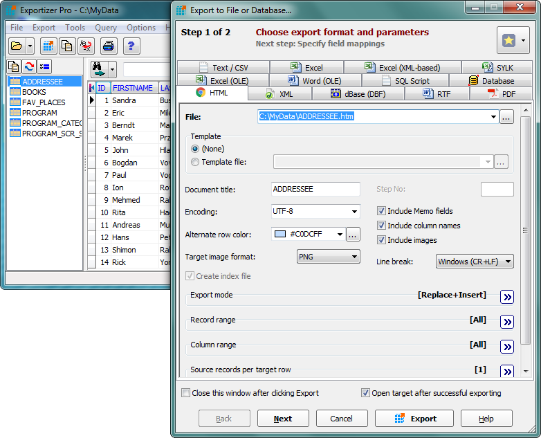Many export options ensure full control over output. There is an ability to specify the source-to-target field mappings.