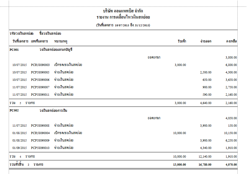 รายงานความเคลื่อนไหวของเงินสดย่อย (Petty Cash)