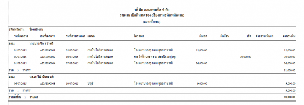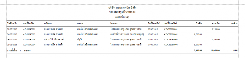 รายงานเบิกเงินทดลอง ชนิด เรียงตามรหัสพนักงาน
