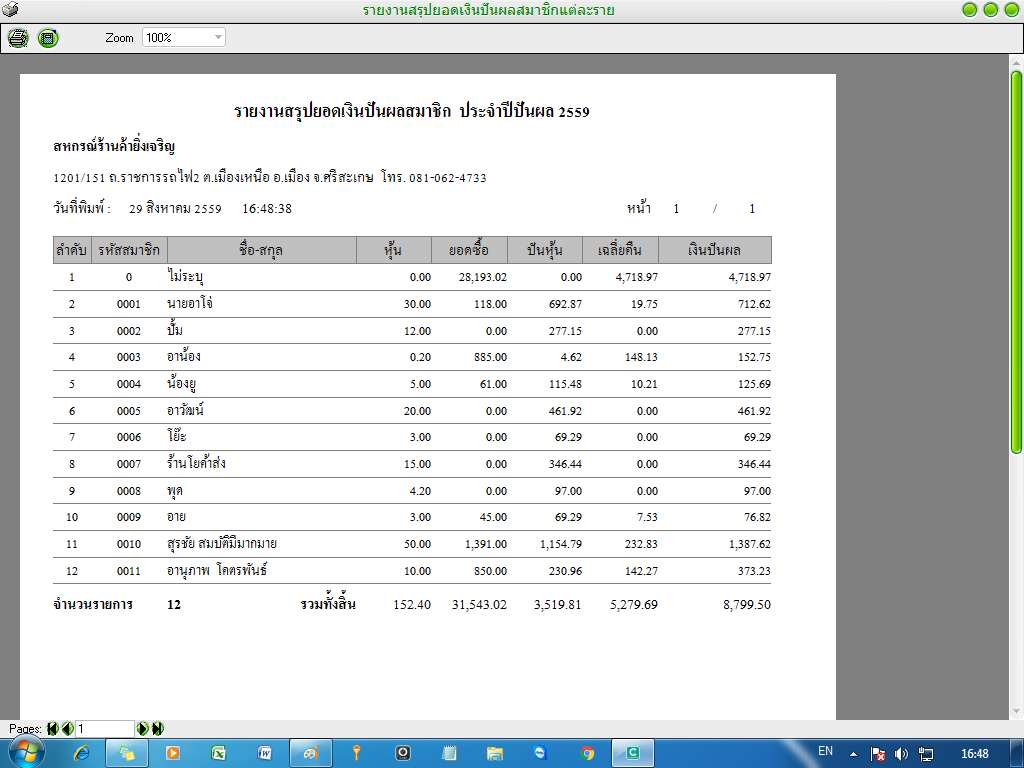 ภาพตัวอย่างการรายงานสรุปยอดเงินปันผล ของโปรแกรม NS Cooperative