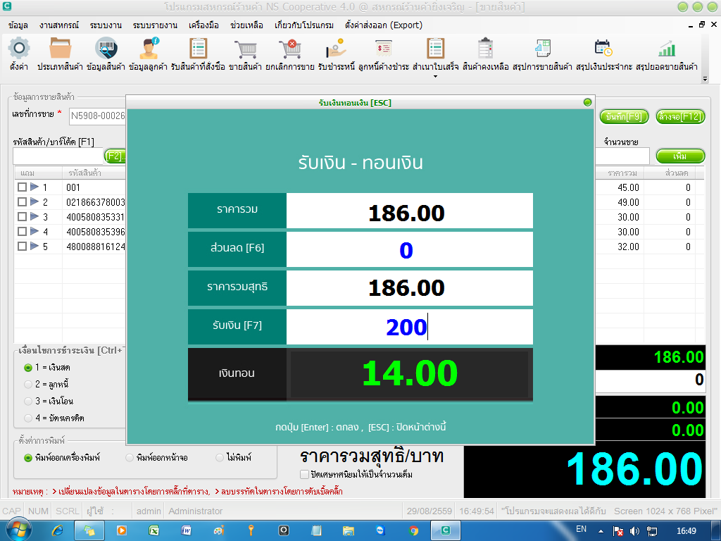 ภาพตัวอย่างการใช้งานของ ระบบรับเงิน-ทอนเงิน ภายในโปรแกรมสหกรณ์ร้านค้า สหกรณ์โรงเรียน NS Cooperative