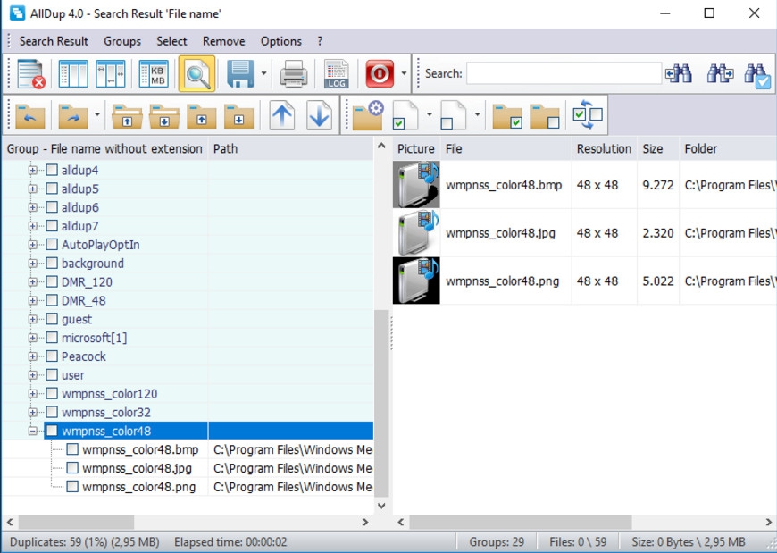 โดยที่โปรแกรม AllDup นี้ สามารถค้นหาไฟล์ได้แทบจะทุกประเภท ไม่ว่าจะเป็น ไฟล์ข้อความ (Text File) ไฟล์เอกสาร (Document File) ไฟล์รูปภาพ (Image File) ไฟล์เสียง (Audio File) ไฟล์วิดีโอ (Video File) รวมถึงไฟล์ประเภทอื่นๆ อีกมากมาย นอกจากนี้โปรแกรมยังมีฟังก์ชั่นสำหรับเปิดดูไฟล์ (File Preview) ก่อนที่จะทำการลบได้ เพื่อตรวจสอบให้แน่ใจอีกครั้ง ว่าเป็นไฟล์ซ้ำที่ต้องการจะลบจริงๆ หรือไม่