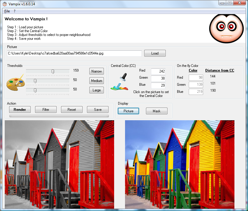 This program is called "Vampix". It is designed to make nice Color / Black+White effect to your pictures with more features as Nice Color vs B&W effects. Custom color selection. Custom effect threshold and Easy presets. Then you can save as the new image in JPEG File format.