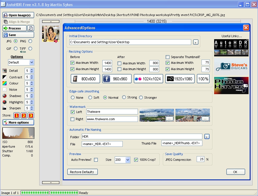 AutoHDR (โปรแกรมแต่งรูปแบบ HDR โหมด ย่อขยาย ลดขนาดไฟล์ ใช้ง่าย) : สำหรับโปรแกรมนี้มีชื่อว่า โปรแกรม AutoHDR จัดอยู่ในประเภทของ โปรแกรมแต่งรูป ที่มีขนาดเล็กมากๆ แต่จัดเต็มไปด้วยฟังก์ชั่นการใช้งานด้านการตกแต่งรูปภาพที่ครบครัน สามารถแต่งรูปภาพให้เป็นเอฟเฟค (Effect) ของภาพแบบโหมด HDR (High Dynamic Range) ซึ่งเป็นภาพที่มีความคมชัดสูง และสามารถแสดงรายละเอียด และสีสันของภาพออกมาได้อย่างชัดเจน