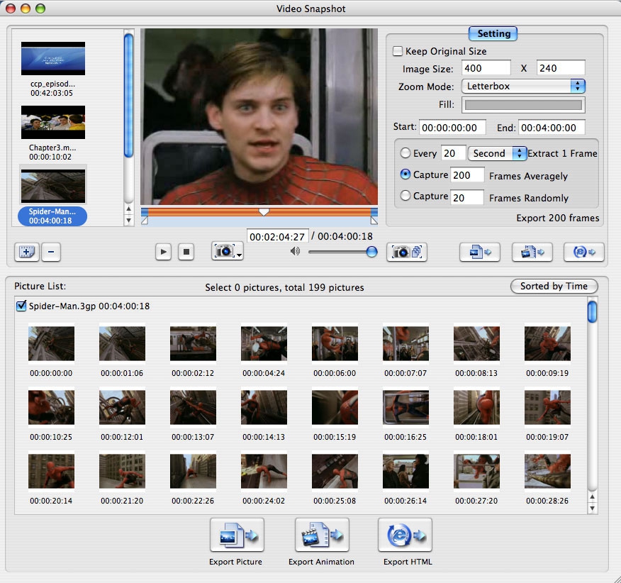 This program is called "Xilisoft Video Snapshot". It is a Video Snapshot for Mac provides the best solution on how to take picture from a video on Mac computer. The Mac video to JPEG tool offers single video snapshot and batch capture modes to extract JPEG, PNG, GIF or BMP picture from AVI, MPEG, DivX, XviD, RM, MP4, M4V, MOV, WMV, etc. videos.