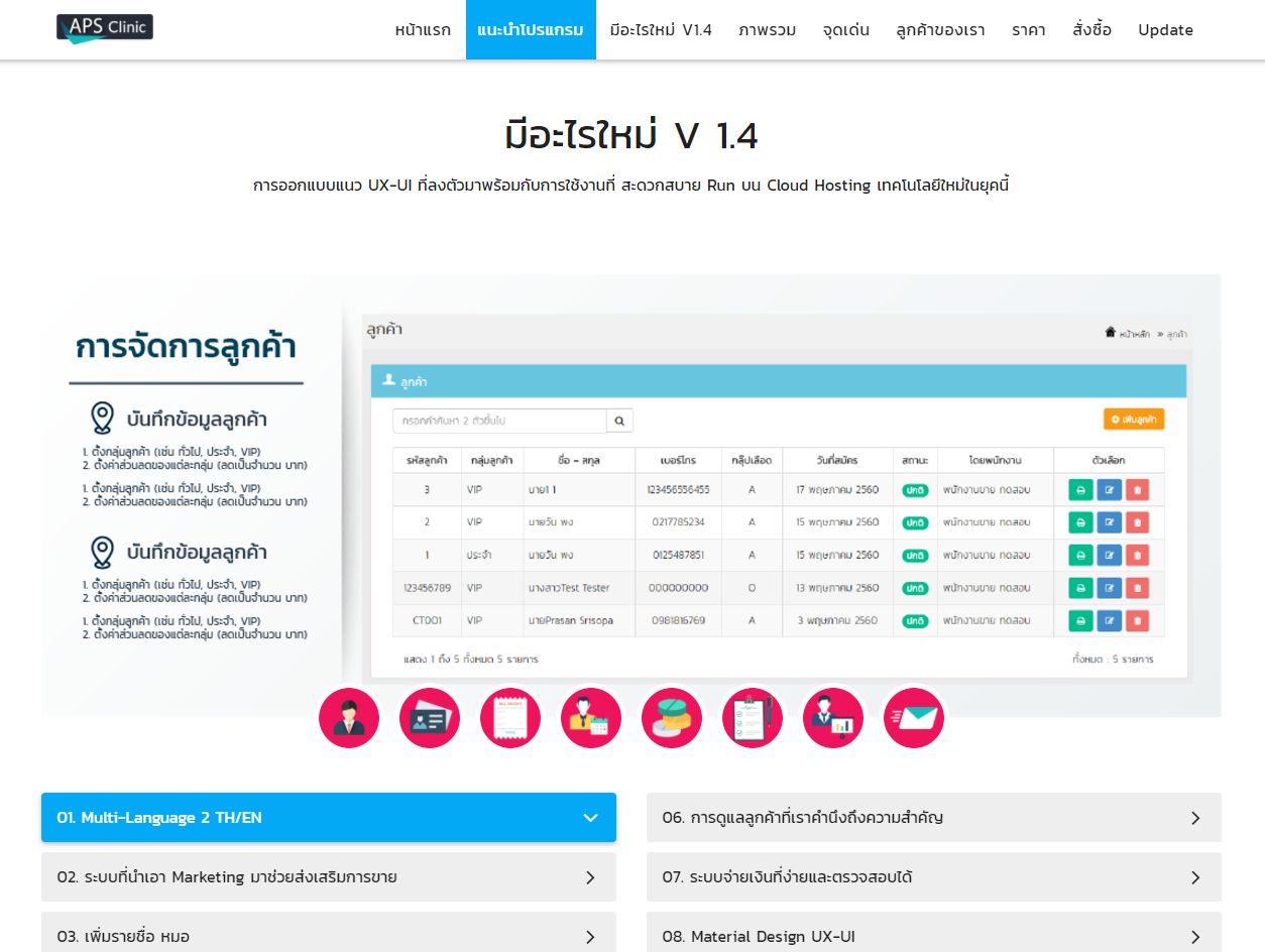 โปรแกรม Clinic 2017 จัดการบริหารคลินิก เหมาะสำหรับ คลินิกเสริมความงาม คลินิกหมอฟัน คลินิกสัตว์ คลินิกทันตกรรม คลินิกทั่วไป การออกแบบแนว UX-UI ที่ลงตัวมาพร้อมกับการใช้งานที่ สะดวกสบาย Run บน Cloud Hosting เทคโนโลยีใหม่ในยุคนี้ www.apsth.com 1. กำหนด สิทธิ์ในระบบ แบ่งออกเป็น 3 สิทธิ์ สิทธิ์ เจ้าของ / ผู้ดูแล มีสิทธิ์ทุกอย่างในระบบ สิทธิ์ หมอ / มีสิทธิ์ทุกอย่างในระบบ สิทธิ์ พนักงาน มีสิทธิ์ในระบบ ในการดูแล ลูกค้าท่านได พนักงานคนไหนดูแล 2. บันทึกข้อมูลลูกค้า และดูรายการที่มาใช้บริการ ต่างๆ ทั้งหมด ( OPD Card Online ) 3. บัญชี การจ่ายเงิน สามารถแบ่ง จ่ายเป็นงวดๆๆ 4. กำหนดนัด หมาย วันเวลานัดหมาย 5. ส่ง Email ในฐานข้อมูลลูกค้า ระบบที่นำเอา Marketing มาช่วยส่งเสริม Promotion 6. ตารางงานหมอ ที่เชื่อโยง กับตารางนัดลูกค้า 7. เพิ่มราคา ส่วนลด 8. รายการใบเสร็จ สามารถดูรายการยอนหลังได้และเช็คความถูกต้อง 9. กำหนด หมวดหมู่ยา 10. การจัดการ หัตถการ / คอร์ส 11. เพิ่มรายการยา และใส่รายละเอียด ของยา (เช่น ราคา รูป หน่วยนับ เป็นต้น) 12. สรุปรายงานการใช้ ยา บจ. 8 13. พิมพ์ฉลาก สติ๊กเกอร์ ป้ายราคา และวิธีการใช้ยาได้ 14. สรุปรายงานทุกอย่าง สามารถค้นหาได้ตามต้องการ และ รายงาน สามารถส่งออก Excel |