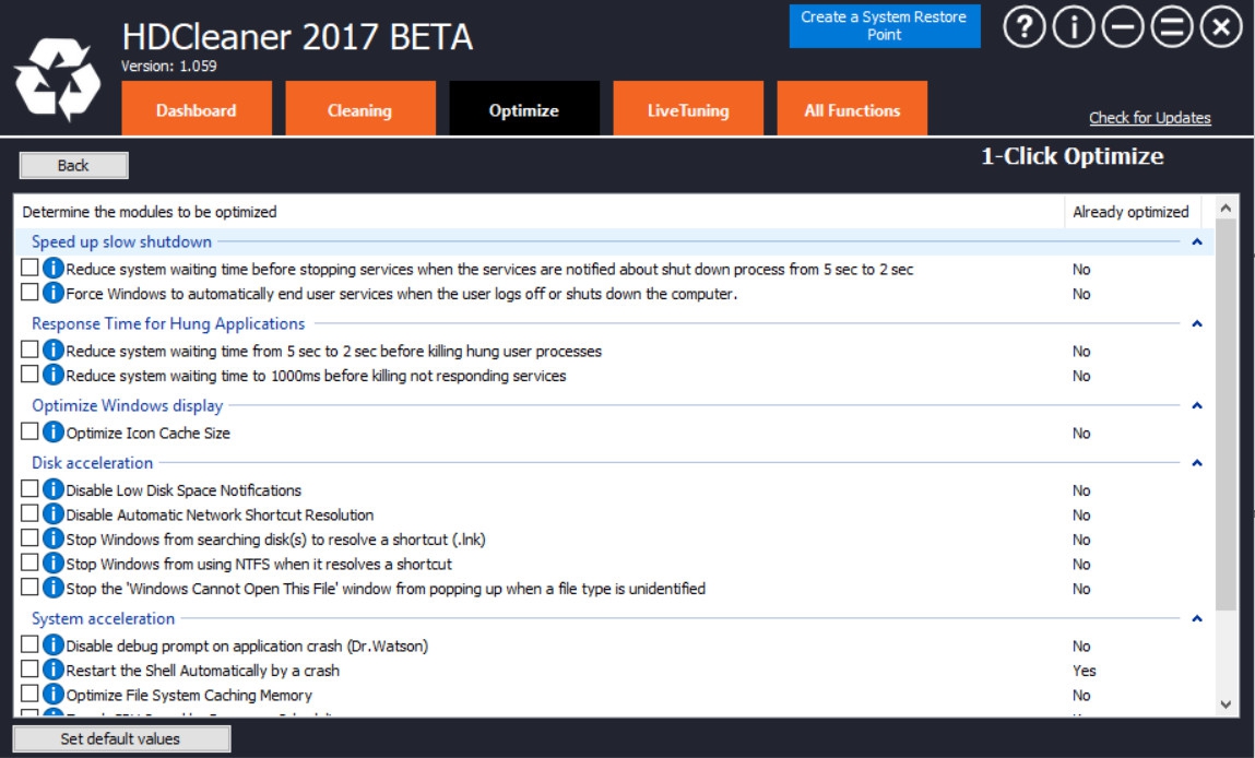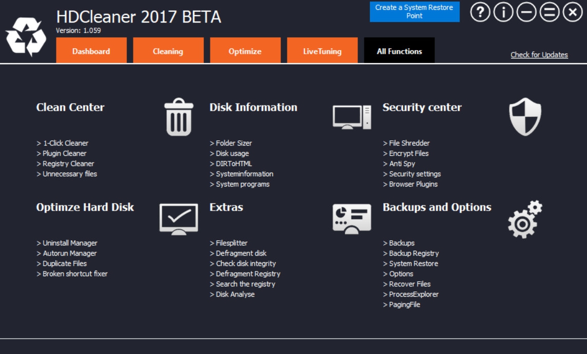 นอกจากจะลบไฟล์ขยะได้แล้ว ตัวโปรแกรม HDCleaner 2017 ยังมีฟีเจอร์ให้เราเลือกใช้งานอีกมากมาย ไม่ว่าจะเป็น ตั้งค่าระบบความปลอดภัย, ตั้งค่าโปรไฟล์สำหรับใช้งาน, สร้างจุด Restore, และอื่นๆ อีกมากมาย ซึ่งเหมาะกับผู้ใช้งานทั่วไปตามบ้าน