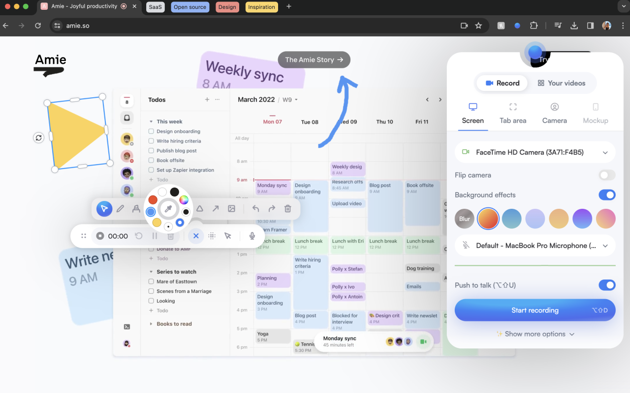 Screenity’s core features include multiple screen recording modes: capturing a specific browser tab, a selected area, the entire screen, or even a webcam feed. It also supports audio recording from both the microphone and system audio. Additionally, it offers a "Push To Talk" feature to control voice input during recording.