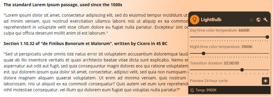 ภายในโปรแกรม LightBulb สามารถปรับแสงตามอุณหภูมิของสีได้อย่างละเอียดตั้งแต่ค่าสูงสุด (Maximum color temperature) ที่ 6600K ซึ่งจะเป็นแสงสว่างสีขาวแกมฟ้านิดๆ เป็นค่าของแสงธรรมชาติที่อยู่ในช่วงเวลากลางวัน และ ค่าต่ำสุด (Minimum color temperature) ที่ 3900K ซึ่งเป็นค่าที่มีแสงแบบวอร์มไวท์ (Worm White) ที่มีความสว่างในโทนออกเหลืองนิดๆ ช่วยถนอมสายตา เปรียบเทียบได้กับแสงจากธรรมชาติภายนอกในเวลากลางคืนนั่นเอง