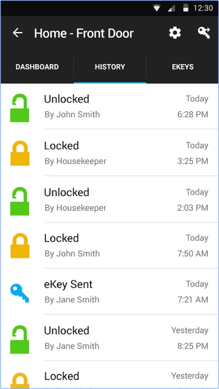 ผู้ดูแลระบบล็อกประตูอัจฉริยะของ Kevo หรือเจ้าของบ้าน สามารถส่งกุญแจอิเล็กทรอนิกส์ หรือ eKey ไปยังสมาร์ทโฟนของสมาชิกทุกคนภายในบ้านได้อย่างง่ายดาย และสามารตรวจสอบ History ย้อนหลังได้ว่า ใครปลดล็อก หรือ มาเปิดประตูเข้าบ้าน บ้างในเวลาไหน อย่างไร และยังสามารถส่ง eKey แบบชั่วคราวให้กับแขกที่มาเยี่ยมบ้าน หรือส่ง eKey แบบตามระยะเวลา ให้สำหรับแม่บ้านที่ต้องเข้ามาทำความสะอาดบ้าน ตามวันและเวลาที่กำหนดในทุกสัปดาห์ได้ด้วย