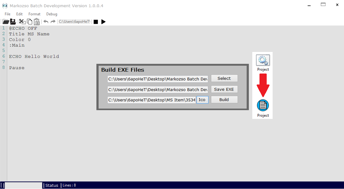 รูปภาพตัวอย่าง Screenshot การบันทึกไฟล์ออกมาในรูปแบบ EXE ของโปรแกรม Markozso Batch Development