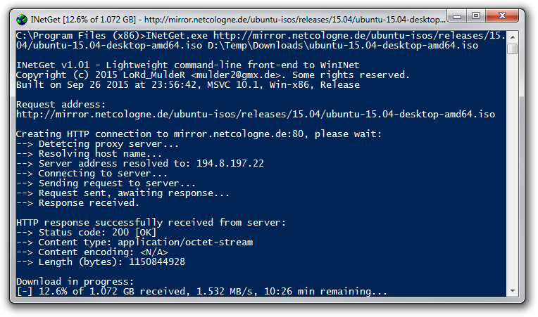 นอกจากนี้ โปรแกรม INetGet ยังรองรับ การแสดงข้อมูลรายละเอียดต่างๆ ระหว่างการดาวน์โหลดไฟล์อีกด้วย ไม่ว่าจะเป็น แสดง IP เซิร์ฟเวอร์ ชนิดของไฟล์ข้อมูลที่คุณดาวน์โหลด ขนาดของไฟล์ที่ดาวน์โหลด รวมไปถึง ประมาณความเร็วในการดาวน์โหลดไฟล์ นั่นเอง โดยประโยชน์ของ โปรแกรม INetGet ซึ่งสั่งแบบการพิมพ์คำสั่งเอง แบบนี้คือ คุณสามารถเขียนโปรแกรม เขียนสคริปต์ ตั้งเวลาให้โปรแกรมดาวน์โหลดไฟล์อัตโนมัติ ได้อีกด้วยเช่นกัน