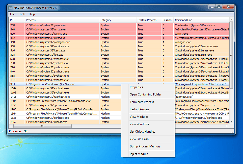This program is called "NoVirusThanks Process Lister". It is a useful Windows tool that allows the end user to see all processes running within their system and allows you to manipulate them. Many options such as termination, memory dumping, enumeration of loaded modules, handle table traversal etc. are available to you. Multiple columns of information about the process are also available, options that Task Manager doesn’t provide.