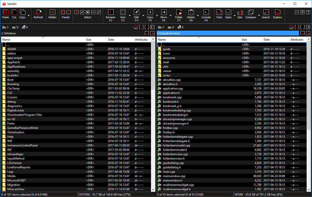 This program is called "Saladin". It is an open source dual-pane file manager for Windows which merges the capabilities of Windows Explorer with the well known and easy to use orthodox user interface. Saladin supports both 32-bit and 64-bit versions of Windows.