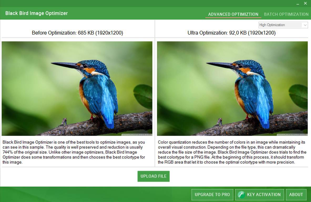 ในส่วนของ การใช้งานโปรแกรม Black Bird Image Optimizer ตัวนี้ คุณสามารถเลือกไฟล์ที่จะนำมาปรับลดขนาด ด้วยการกด "ปุ่ม Upload File" หลังจากนั้นโปรแกรมก็จะแสดงคุณภาพก่อนหน้า (Before) และ หลัง (After) จากปรับขนาดไฟล์รูปให้ดู พร้อมกับขนาดความกว้าง (Width) และ ความสูง (Height) ของรูปภาพ พร้อมกับขนาดไฟล์ที่ถูกปรับลง เปรียบเทียบให้ดู นอกจากนี้แล้ว โปรแกรมยังมีความสามารถในการปรับขนาดไฟล์ของรูปภาพทีละมากๆ ในครั้งเดียวกันได้อีกด้วย ในฟังก์ชั่น "Batch Optimization" เพิ่มความสะดวก มากขึ้นไปอีก