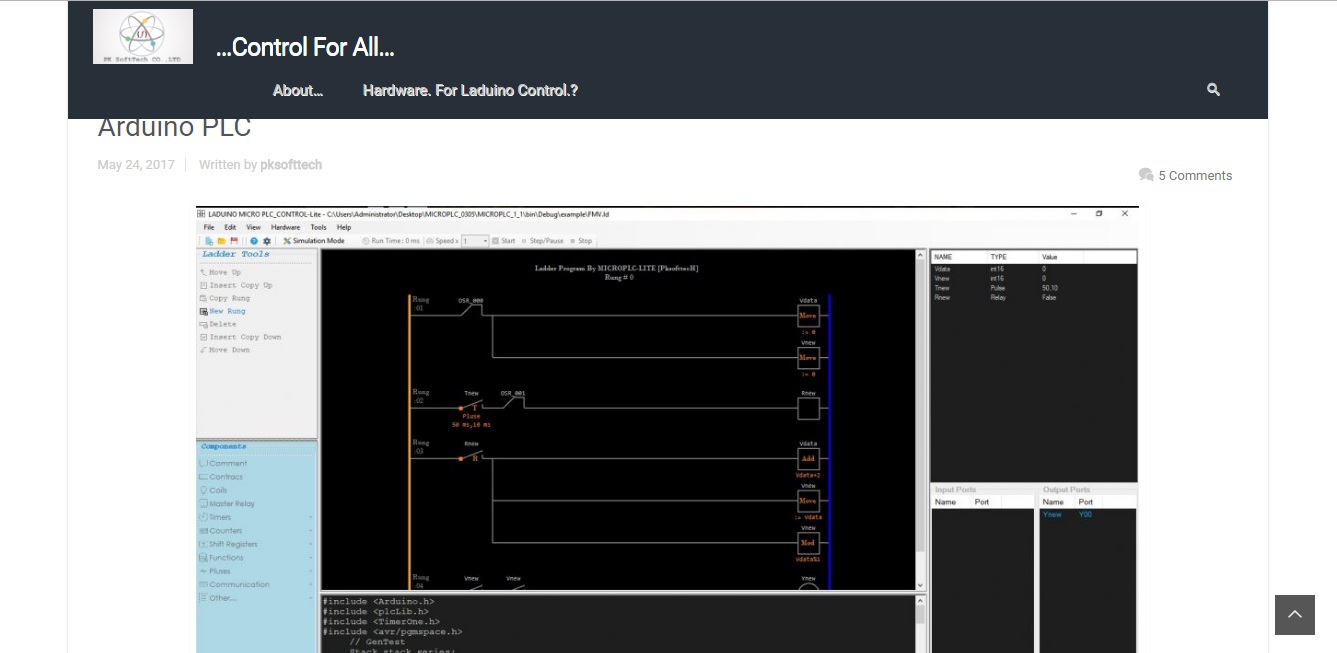 LADUINO CONTROL (โปรแกรม Laduino Control เขียนภาษาแลดเดอร์ บนโมดูล PLC) : สำหรับโปรแกรมนี้มีชื่อว่า โปรแกรม LADUINO CONTROL มันเป็นโปรแกรมที่ค่อนข้างเฉพาะทาง เหมาะสำหรับผู้ที่ศึกษาด้านตัวควบคุมบอร์ด แผงวงจรไฟฟ้าของฮาร์ดแวร์ที่ใช้งานกับไมโครคอนโทรเลอร์ (Micro Controller) ซึ่งมีลักษณะการทำงานคล้ายกับเครื่องไมโครคอมพิวเตอร์ขนาดเล็ก ใช้ในการควบคุมระบบการทำงานของอุปกรณ์เฉพาะด้านในแบบต่างๆ
