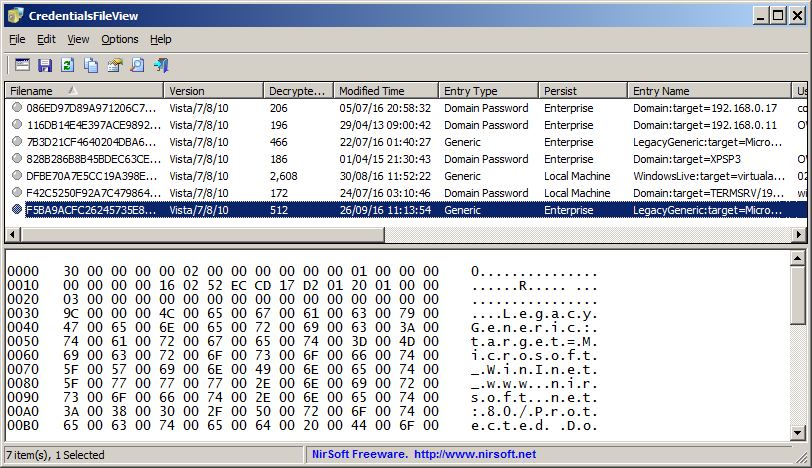 This program is called "CredentialsFileView". It is a simple tool for Windows that decrypts and displays the passwords and other data stored inside Credentials Files of Windows. You can use it to decrypt the Credentials data of your currently running system, as well as the Credentials data stored on external hard drive.
