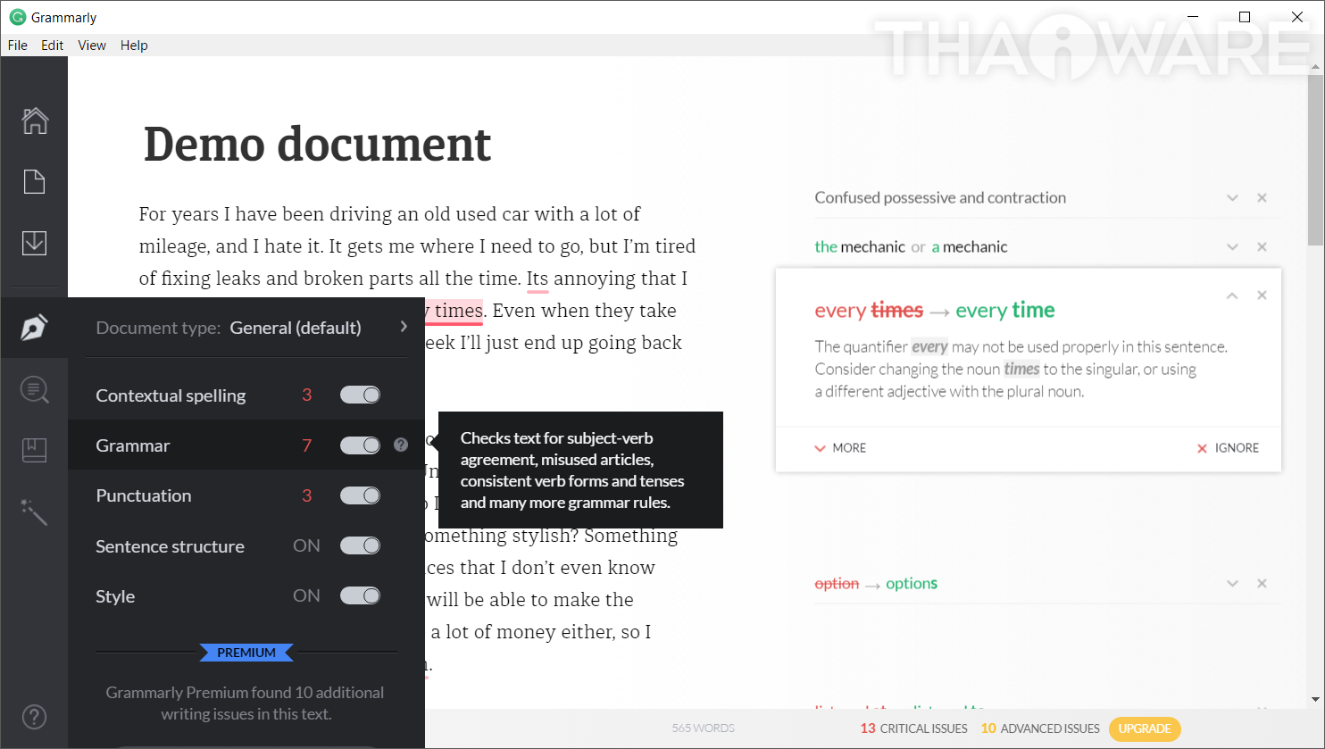 โดยเจ้าตัวโปรแกรม Grammarly นี้นั้น เป็นเครื่องมือสำหรับช่วยเช็คประโยคภาษาอังกฤษหรือบทความต่างๆ ให้ถูกต้องตามหลักของภาษา ซึ่งมาพร้อมกับ ฟีเจอร์มากมาย ไม่ว่าจะเป็น เช็คไวยากรณ์ (Grammar Check) การสะกดคำ (Spell Check) ความหมายของคำศัพท์ (Dictionary) โครงสร้างประโยค (Sentence Structure) เครื่องหมายวรรคตอน (Punctuation) และ อีกมากมายให้เราได้เลือกใช้กัน โดยจะตรวจเช็คประโยคที่ถูกเขียนลงในโปรแกรม แล้วขีดเส้นใต้สีแดงคำที่ผิด และแสดงคำที่ถูกต้อง หรือ คำเหมือน (Synonyms) ที่ด้านขวามือ