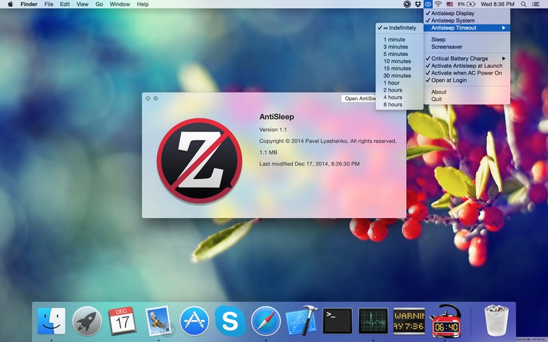 Anti Sleep (โปรแกรม Anti Sleep ป้องกันเครื่อง Mac ดับ ปิดโหมด Sleep ฟรี) : โปรแกรมนี้มีชื่อว่า โปรแกรม Anti Sleep มันเป็นโปรแกรมที่เอาไว้ใช้ในการ "ป้องกันเครื่องดับเอง" หรือการ "ห้ามไม่ให้เครื่องเข้าโหมด Sleep" นั่นเอง โปรแกรมนี้คุณสามารถตั้งให้เครื่องป้องกันการเข้า โหมด Sleep ป้องกันการปิดหน้าจอ (Display) และ ป้องกันการปิดระบบ (System) ได้ คุณสามารถตั้งเวลาเพื่อให้เครื่องเปิดใช้งานตลอดจนกว่าจะหมดเวลา (TimeOut) ได้อีกด้วย
