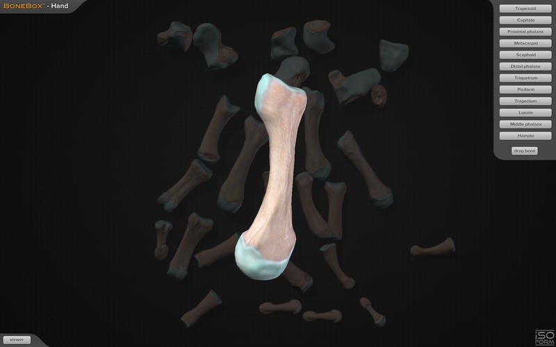 This program is called "BoneBox Hand Viewer". It is a real-time 3D medical education and patient communication tool, featuring incredibly detailed anatomical models of the bones of the human hand. It is a member of a series of apps developed by a team of anatomists, certified medical illustrators, animators, and programmers using actual human CT imaging data, and the most accurate 3D modeling technology available.
