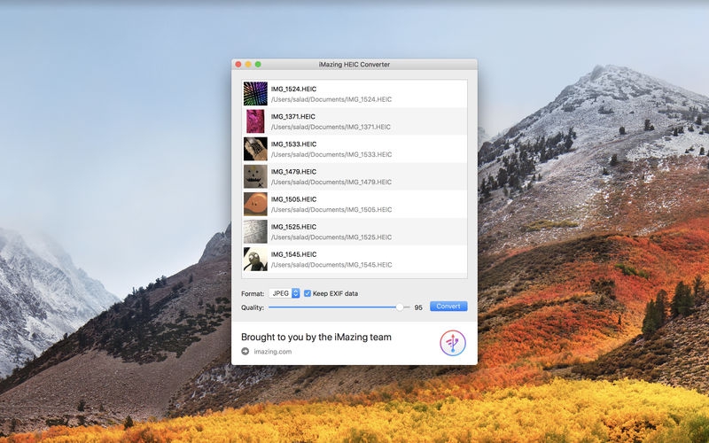 This program is called "iMazing HEIC Converter". It is the first 100% free solution to easily convert pictures taken in the new HEIF format. Easy to use, efficient, and compatible with older macOS versions, it's a cute little utility we hope you'll find useful!