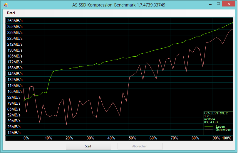 AS SSD Benchmark reads/writes a 1 GByte file as well as randomly chosen 4K blocks. Additionally, it performs the tests using 1 or 64 threads and it determines the SSD's access time. Two extra benchmark tests examine the drive's behaviour when (1) copying a few big files, a lot of small files and a mixture of file sizes by using cached copy functions of your OS as well as (2) reading/writing data depending on the data's compressibility.