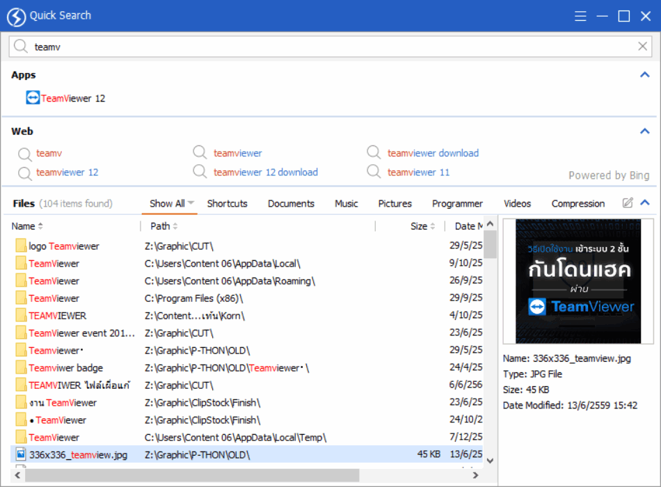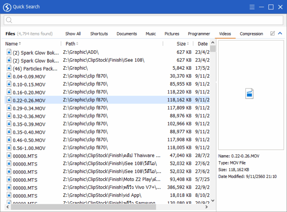 โดยไฟล์ที่แสดงจะแยกแยกเป็น Shortcuts สำหรับหาไฟล์ทางลัด, Documents สำหรับหาไฟล์เอกสารอย่างพวก DOC/XLS/TXT/PDF, Music สำหรับหาไฟล์เสียง MP3/WAV, Pictures หาไฟล์รูปภาพ เช่น JPG/PNG/BMP/TIFF, Programmer สำหรับหาไฟล์ของระบบ, Video สำหรับหาไฟล์วิดีโอ AVI/FLV/MVK, Compression สำหรับหาไฟล์ที่บีบอัดไว้จำพวก RAR/ZIP/7z เป็นต้น ฃสามารถค้นหาได้อย่างรวดเร็วทันใจ นอกจากนี้แล้วยังมีฟีเจอร์เสริม เช่น ทางลัดเข้าโปรแกรม และค้นหาคำจากเว็บไซต์ อีกด้วยนะ ทั้งหมดทั้งมวลนั้น มันจะช่วยให้เราสามารถค้นหาไฟล์ได้สะดวกสบายสุดๆ เลยแหละ