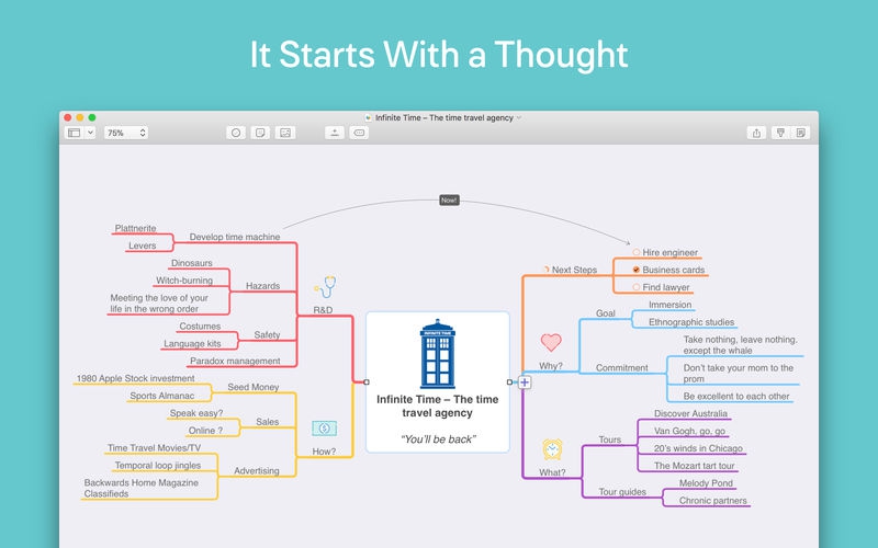 This program is called "MindNode 5". It is a MindNode, It helps you connect your thoughts and clarify your ideas. Try a free 2-week trial of the full app. A clean interface and focused feature set enable you to develop your project. Start with a thought, then take your project from first steps, to the next level, and into action.