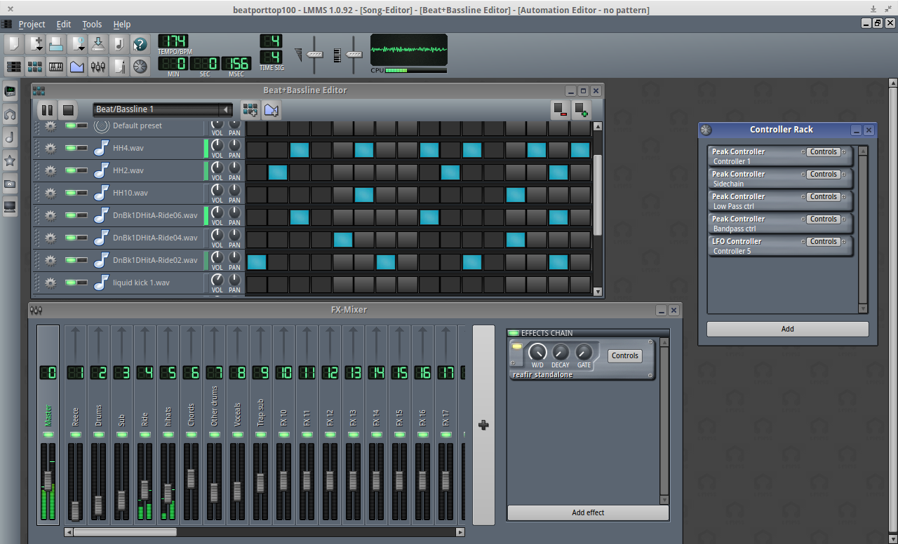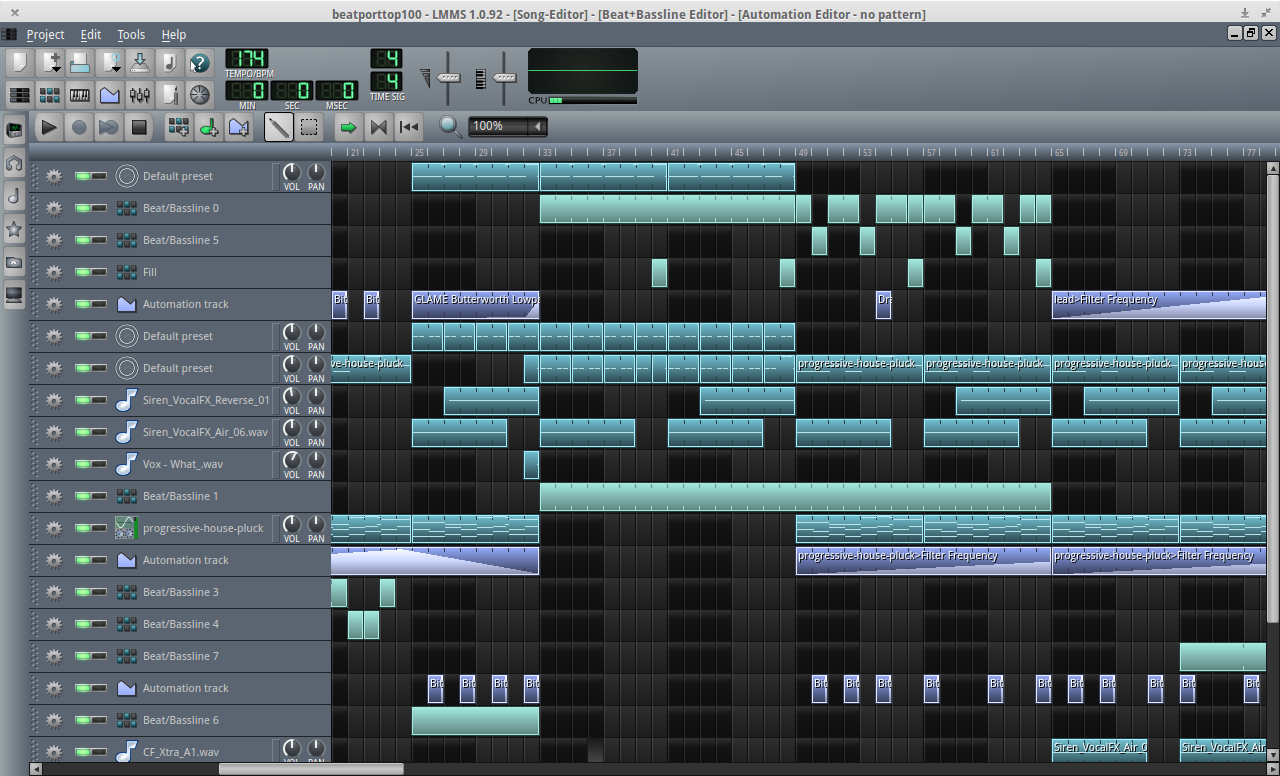 This program is called "LMMS". It is a digital audio workstation application program. When LMMS is executed on a computer with appropriate hardware, it allows music to be produced by arranging samples, synthesizing sounds, playing on a MIDI keyboard, and combining the features of trackers and sequencers. It supports the Linux Audio Developer's Simple Plugin API (LADSPA), and Virtual Studio Technology (VST) plug-ins.[3] It is free software released under the GNU General Public License, version 2 (GPLv2).