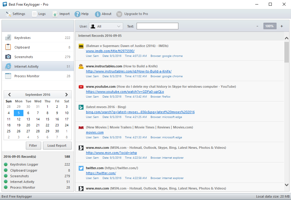Best Free Keylogger (โปรแกรม KeyLogger เก็บประวัติการใช้งานคอมพิวเตอร์ ฟรี) : สำหรับเจ้าตัวนี้ มีชื่อว่า โปรแกรม Best Free Keylogger เป็นตัวช่วยที่จะทำให้เราสามารถเรียกดูประวัติการใช้งานคอมพิวเตอร์ ด้วยฟีเจอร์มากมาย อย่างเช่น เรียกดูข้อมูล Clipboard ที่เราก็อปปี้ (Copy) ไว้ทั้งหมด หรือจะเป็นประวัติการกดพิมพ์ตัวอักษรลงในโปรแกรมต่างๆ เช่น รายละเอียดการพิมพ์บนเว็บเบราว์เซอร์ อย่าง โปรแกรม Google Chrome โปรแกรม Firefox หรือจะเป็น โปรแกรม Office จำพวก โปรแกรม Word โปรแกรม Excel ก็มีให้เราเรียกดูตลอดจนถึงรูปภาพ Screenshot และประวัติการท่องเว็บในแต่ละวัน ซึ่งข้อมูลที่ถูกบันทึกไว้ทั้งหมดนี้ เราสามารถเรียกดูย้อนหลังได้ด้วย