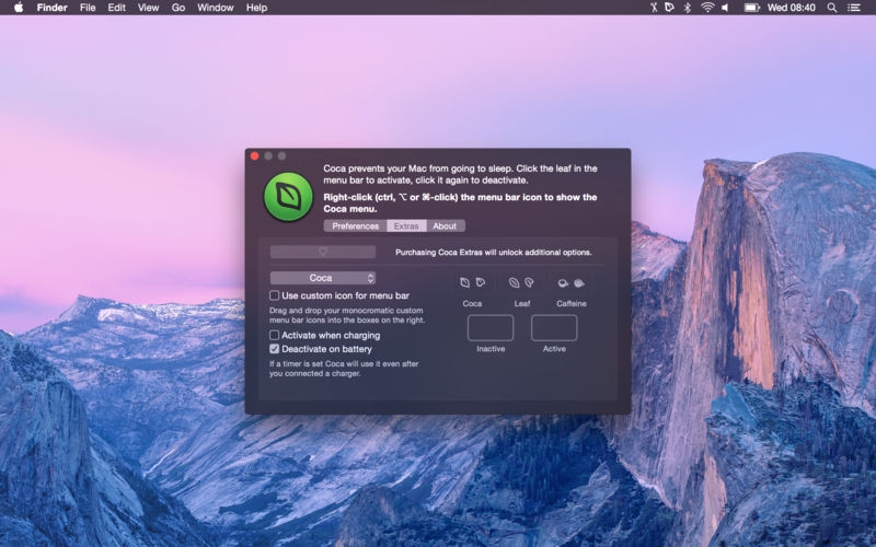 นอกจากนี้แล้ว โปรแกรม Coca ตัวนี้ยังสามารถตั้งค่าให้เครื่องเปิดอยู่ตลอดเวลา เมื่อเสียบเข้ากับปลั๊กไฟเพื่อชาร์จไฟ เครื่องก็จะทำงานได้โดยไม่หลับเช่นกัน หากเราไม่สั่งปิดโปรแกรมเอง แถมยังตั้งค่าไอคอนเป็นรูปต่างๆ ได้ตามที่คุณชอบ ใช้งานได้บน macOS 10.10 Yosemite เป็นต้นไป