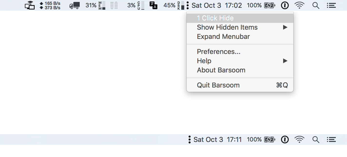 Barsoom 2 (โปรแกรม Barsoom 2 ซ่อนไอคอนในเมนูบาร์ บน Mac) : สำหรับโปรแกรมนี้มีชื่อว่า โปรแกรม Barsoom 2 มันเป็นเครื่องมือที่ช่วยให้คุณสามารถซ่อนไอคอนเล็กๆ ทางด้านบนของเมนูบาร์ในเครื่อง Mac ได้ ย่อไอคอนต่างๆ ลงให้เหลือเพียงอันเดียว โดยปกติการจะย้ายหรือนำไอคอนต่างๆ ของเมนูบาร์ จำเป็นต้องกดปุ่ม Command ค้างไว้จากนั้น ลากไอคอนและวางไว้ภายนอกเมนูบาร์ ไอคอนที่ย้ายได้ก็จะหายไป แต่ด้วยเครื่องมือนี้สามารถย่อและซ่อนไอคอนต่างๆ ได้เพียงแค่คลิกเดียว ใช้งานง่ายช่วยให้แถบเมนูบาร์ของคุณดูสะอาดเป็นระเบียบมากยิ่งขึ้น