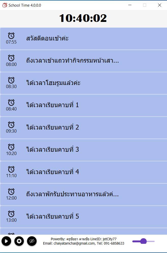 School Time (โปรแกรม School Time ออดโรงเรียน ใส่เสียงพูดได้) : สำหรับเจ้าตัวนี้ มีนามว่า โปรแกรม School Time มันจัดเป็น โปรแกรมตั้งเวลาเปิดเสียงออดบอกเวลา ในโรงเรียน โรงงาน หรือสำนักงาน ซึ่งมีประโยนช์มากๆ สำหรับการบริหารจัดการเวลาได้เป็นอย่างดี โดยไม่ต้องคอยกดกริ่งด้วยมืออีกต่อไป แถมบอกเวลาเป็นเสียง ผู้หญิง ผู้ชาย หรือเด็กผู้หญิง พูดภาษาไทยอีกด้วย โดยเจ้าตัวนี้เป็นโปรแกรมเวอร์ชันทดลองใช้งาน (Demo) ที่ทางผู้พัฒนานำมาแจกให้ใช้กันก่อนเป็นเวลา 15 วัน หากต้องการใช้งานกันต่อก็ต้องติดต่อขอลงทะเบียนกับทางผู้พัฒนา