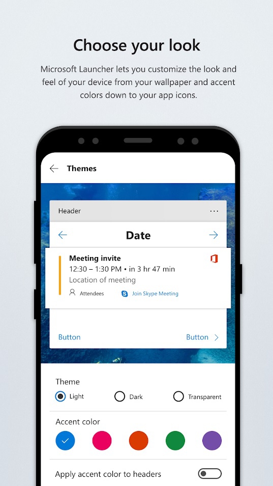 Microsoft Launcher (App ปรับเปลี่ยนหน้าตา Android ด้วยเครื่องมือของ Microsoft) : สำหรับแอปพลิเคชันนี้มีชื่อว่า แอป Microsoft Launcher แอปฯ ตัวนี้คือระบบ Launcher ที่จะปรับเปลี่ยนหน้าตาและประสบการณ์ในการใช้งานอุปกรณ์ Android ให้สุดยอดเยี่ยมกว่าที่เคย ปรับแต่งหน้าตาของระบบ Android ให้ตรงกับรสนิยมของเราได้ตามต้องการ ไม่ว่าจะเป็นการเปลี่ยนวอลล์เปเปอร์, ธีมสี, ชุดไอคอนแบบใหม่ๆ และอื่นๆ อีกมากมาย ล็อกอินเข้าระบบ Microsoft ด้วยแอคเคาท์ส่วนตัว หรือแอคเคาท์ของที่ทำงาน หรือแอคเคาท์ของโรงเรียน เพื่อการนำรายการบน Calendar เอกสาร และกิจกรรมต่างๆ บนผลิตภัณฑ์ Microsoft มาแสดงบนหน้าฟีดของ Launcher ทำให้รับรู้หมายกำหนดการและรายละเอียดต่างๆ ได้อย่างง่ายดาย นอกจากนี้คุณยังสามารถใช้สมาร์ทโฟนถ่ายภาพ แล้วแก้ไขภาพนั้นผ่านเครื่องคอมฯ ที่รัน Windows ได้ทันที