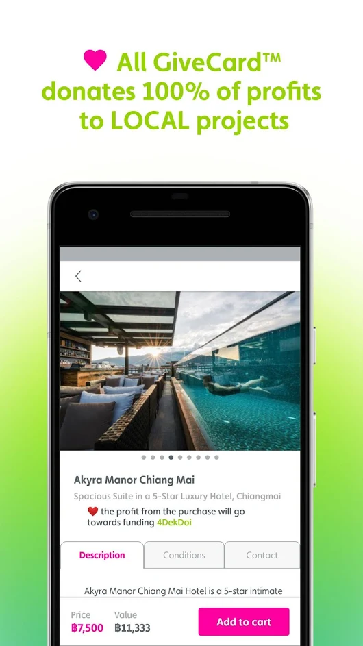 This app is called "Socialgiver". This is an award-winning Social Enterprise in Thailand that fundraises for causes you care about. Shop lifestyle expereinces, whether it's hotels, restaurants or activities. 100% of profits from all giftcards purchased will go to support local charity in Thailand.