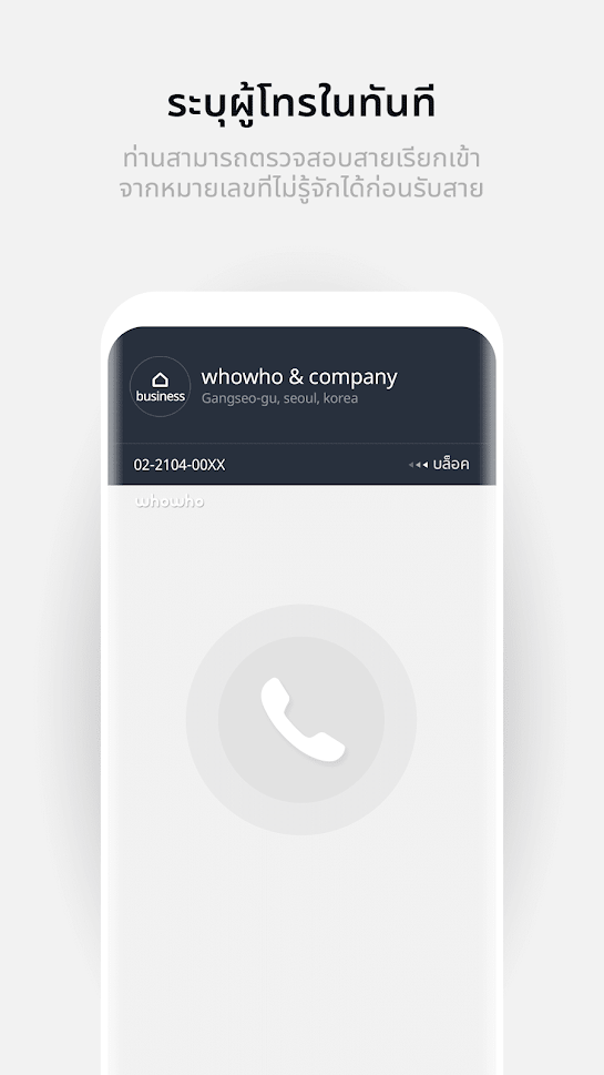 โดยคุณสมบัติของแอป whowho ตัวนี้คือสามารถตรวจสอบข้อมูลผู้โทรได้ทันทีที่มีสายเข้า แจ้งการระบุตัวตนผู้โทรของหมายเลขที่ไม่รู้จักในทันที นอกจากจะมีการแสดงชื่อและที่อยู่ของบริษัทแล้ว ก็ยังสามารถให้ข้อมูลที่ถูกลงทะเบียนจากผู้ใช้รายอื่นในรูปแบบของ สแปม ปลอดภัย รายงาน หรือจะเลือก บล็อก ได้ในทันที