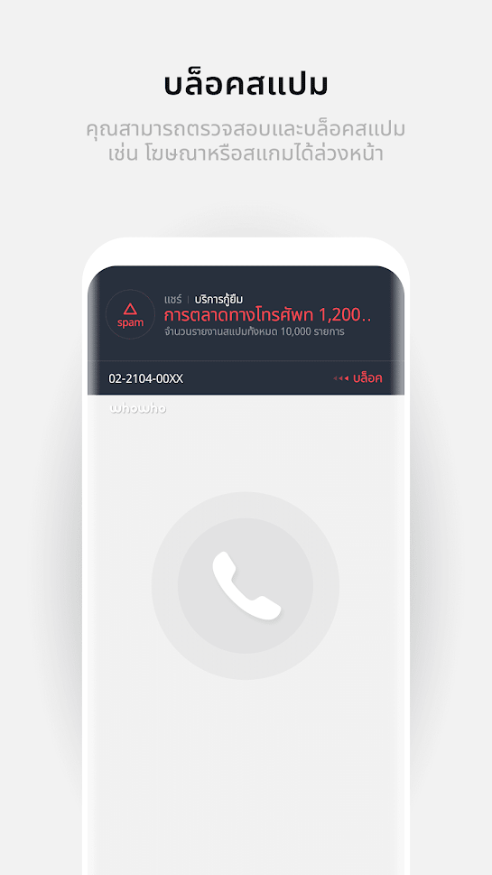 Application Features (คุณสมบัติหรือความสามารถของแอปพลิเคชัน บล็อกสายโทรเข้าชวนสมัครบัตรเครดิต บล็อกเบอร์สแปม whowho เพิ่มเติม)