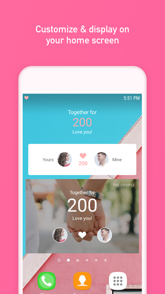 THE COUPLE (App ปฏิทินคู่รัก วันครบรอบ วันสำคัญ THE COUPLE) : สำหรับแอปพลิเคชันนี้มีชื่อว่า แอป THE COUPLE แอปฯ ดีๆ สำหรับคู่รัก ปฏิทินคู่รัก นับจำนวนวันตั้งแต่เริ่มคบกัน เตือนเมื่อถึงวันสำคัญอย่างเช่นคบกันถึง 100 วัน 200 วัน หรือครบรอบปีที่คบกัน เติมเต็มความรักในโอกาสพิเศษให้กลิ่นไอความรักไม่มีจืดจาง แสดงจำนวนวันตั้งแต่เริ่มคบกันให้เห็นชัดๆ บนหน้าจอผ่าน Widget ที่ปรับแต่งได้ถึง 3 รูปแบบ ปรับขนาด Widget ให้เล็กใหญ่ได้ตามต้องการ