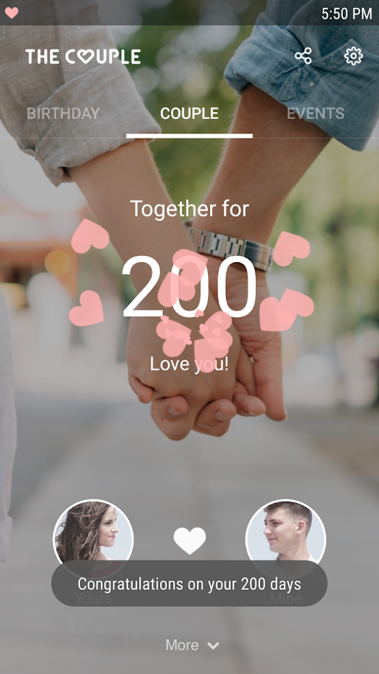 This app is called "THE COUPLE". This is a stylish and easy-to-use app for all couples in love. Never miss your couple’s special occasions and celebrate your love! Check your couple’s special days (100th day in love, 1 year anniversary). You can receive reminders for each one. Multiple hearts will be shown on your loved one’s birthday.