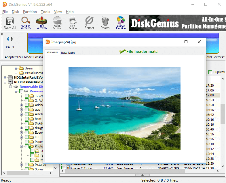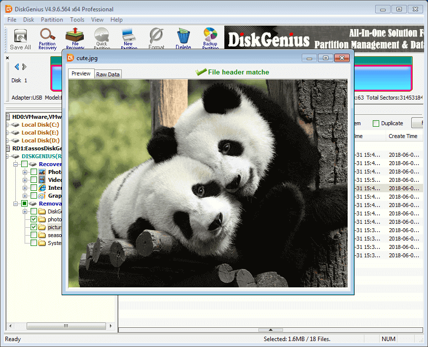 วิธีการใช้งานโปรแกรมกู้ข้อมูล DiskGenius Data Recovery ก็แสนง่าย เพียงแค่เลือกไดร์ฟ (Drive) ที่ต้องการทางด้านซ้าย แล้วก็กดสแกน เมื่อค้นหาเสร็จแล้ว ก็สามารถเปิดดูตัวอย่าง (Preview) ไฟล์ก่อนทำการกู้ข้อมูลได้เลย เพียงแค่ 3 ขั้นตอนเท่านั้น เหล่าไฟล์ที่เคยหายไปก็จะถูกกู้กลับมาทันที
