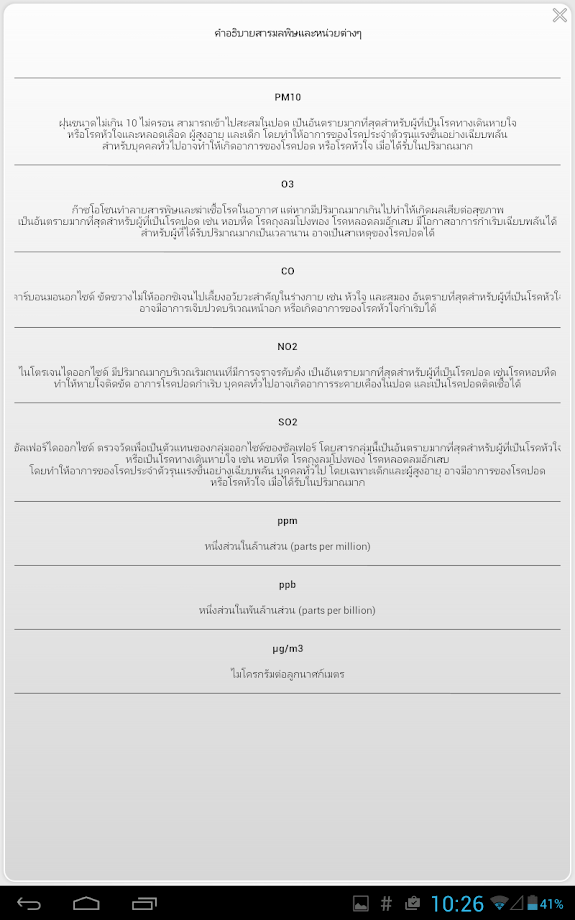 Air4Thai (App ตรวจสอบปริมาณฝุ่นควัน ในกรุงเทพ และทั่วประเทศ Air4Thai) : สำหรับแอปพลิเคชันนี้มีชื่อว่า แอป Air4Thai แอปพลิเคชันอย่างเป็นทางการของ กรมควบคุมมลพิษ รายงานดัชนีคุณภาพอากาศของประเทศไทย ตรวจสอบปริมาณ และระดับความอันตรายของฝุ่นควัน ในกรุงเทพฯ และทั่วประเทศ โดยรายงานข้อมูลรายชั่วโมง (สำหรับบางสถานี) และข้อมูลรายวัน กราฟคุณภาพอากาศย้อนหลัง 7 วัน พร้อมแผนที่แสดงโดยเป็นข้อมูลจากสถานีตรวจวัด ของกรมควบคุมมลพิษครอบคลุมพื้นที่ทั่วประเทศ เพื่อเป็นข้อมูลเผยแพร่แก่ประชาชนทั่วไป โดยเฉพาะในช่วงที่เป็นสถานการณ์วิกฤติหมอกควันในพื้นที่ กรุงเทพฯ รวมถึงทางภาคเหนือ และภาคใต้ของประเทศ