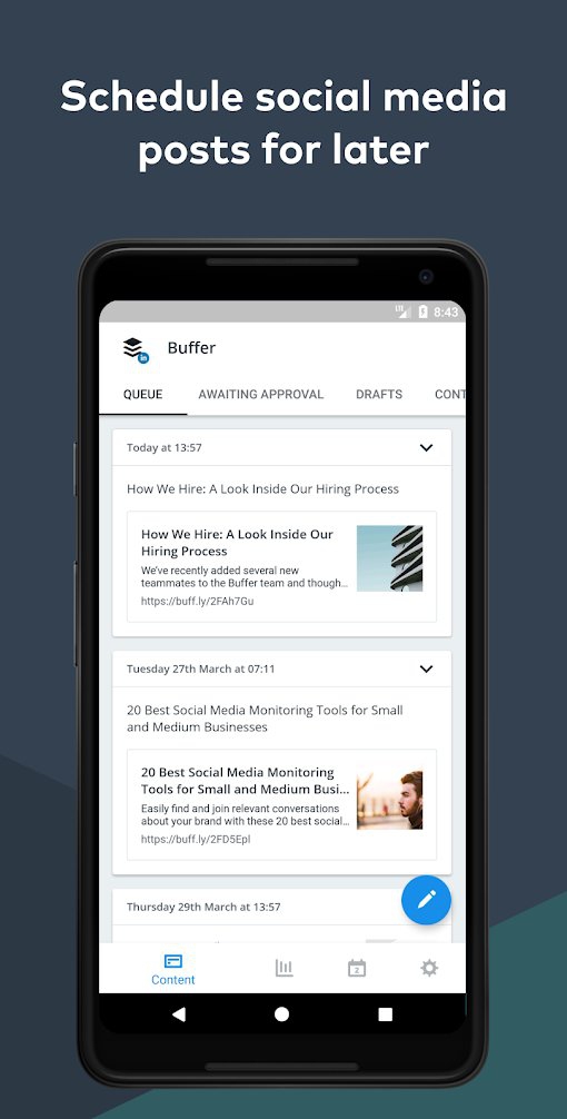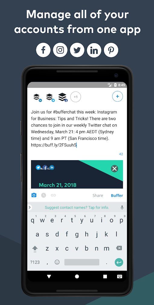 Buffer (App Buffer แชร์โพสต์ลงบนทุก Social Media แบบง่ายๆ ในครั้งเดียว) : สำหรับเจ้าตัวนี้ มีชื่อว่า แอปพลิเคชัน Buffer มันเป็นแอปฯ ที่ช่วยให้เราสามารถบริหารจัดการโซเชียลมีเดียหลายๆ แพลตฟอร์มได้ในตัวเดียว (Social Media Manager) ไม่ว่าจะเป็น การโพสต์ลง Facebook, Instagram, Twitter, Pinterest และ LinkedIn ก็ทำได้ในครั้งเดียว และสามารถเช็คยอดของโพสต์ต่างๆ ได้ในหน้าเดียว แค่สไลด์หน้าจอขึ้นลง ไม่ต้องสลับแอปฯ ไปมา ให้สับสนและเสียเวลาเปล่าๆ